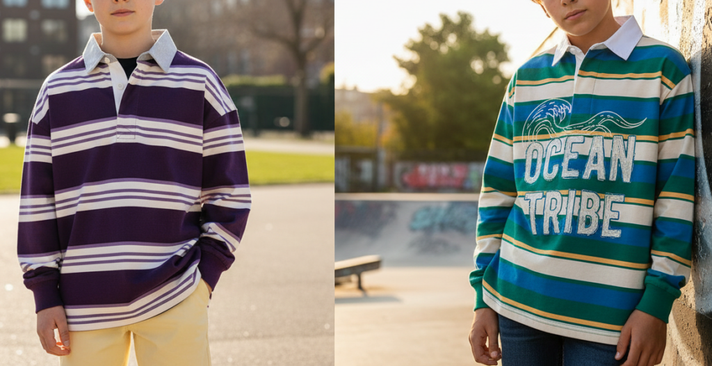 חולצות רוגבי עם פסים, קצת אוברסייז, וצווארון פתוח.